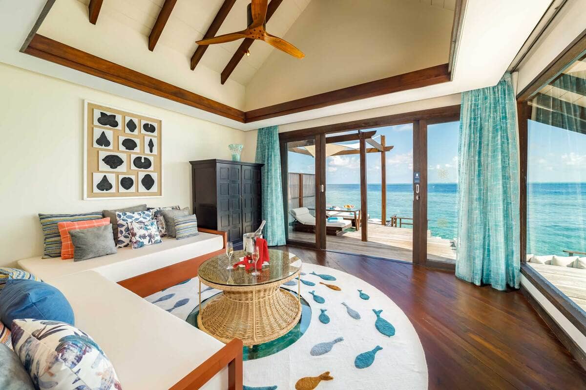 238 кв. м: терраса с открытым персональным бассейном, спальня с гостиной зоной (кровать king-size), ванная комната с ванной и душем c функцией «тропический дождь». Расположены на сваях над водой. Вид на океан. Спуск в воду.