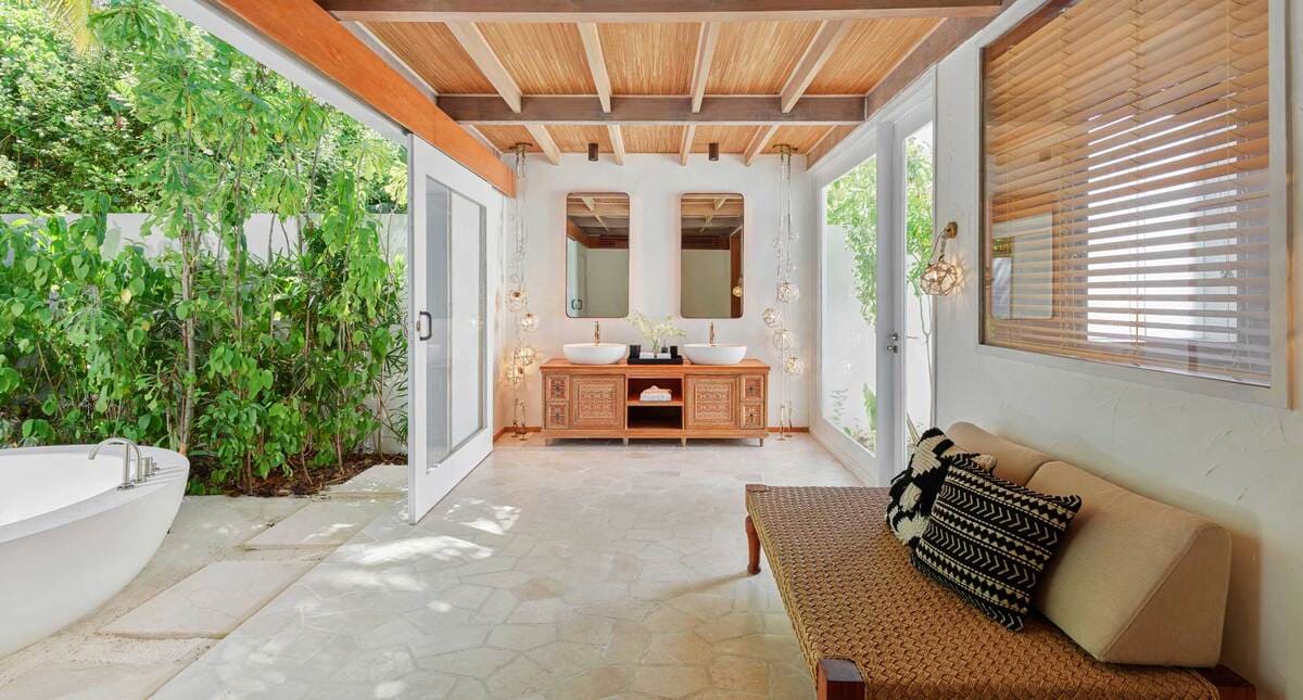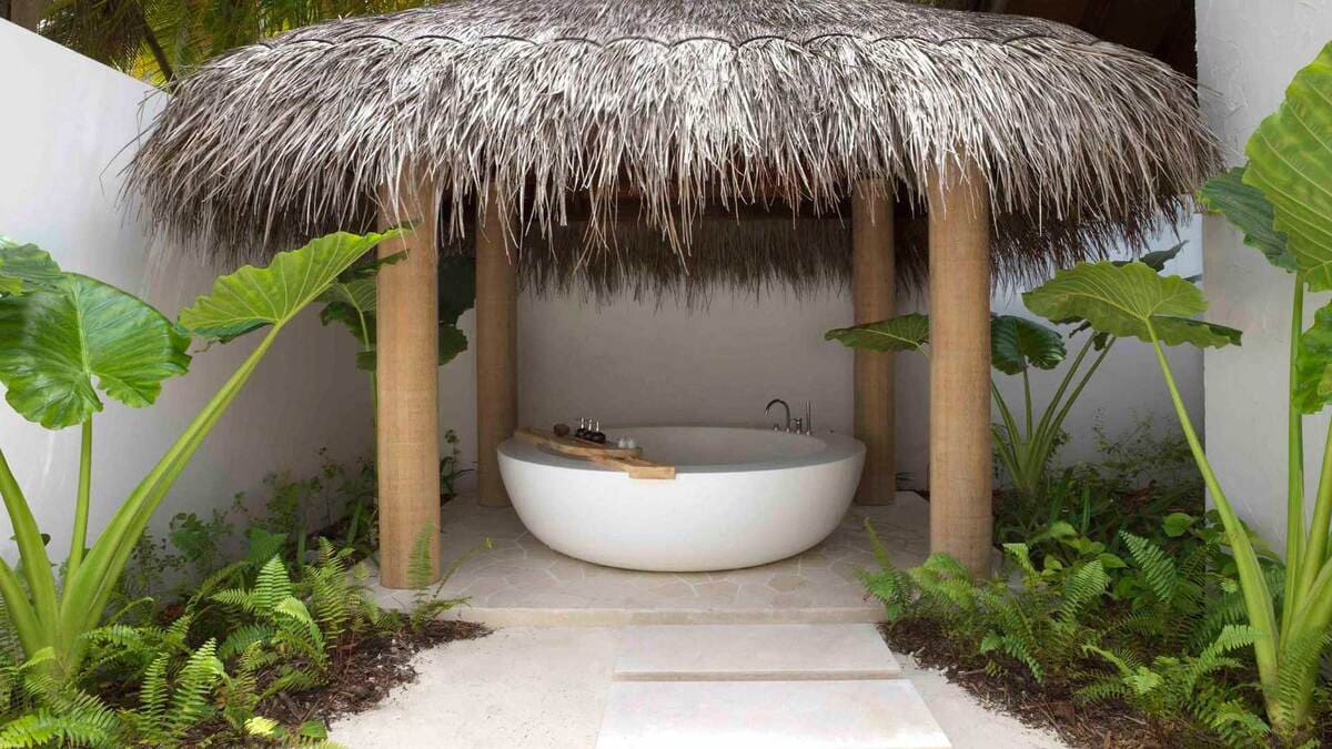 360 кв. м: частный сад, терраса с небольшим открытым персональным бассейном, спальня с гостиной зоной (кровать king-size), ванная комната с ванной и душем на открытом воздухе. Расположены в саду рядом с пляжем. Вид на закат.